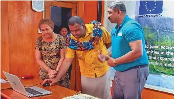 Non-Government organisation, Live and Learn Environmental Education Fiji, country manager, Doris Susau (left), and Ecosystems-based Climate Adaptation Project (ECAP) (right), Subesh Prasad shows Divisional Planning Officer, Setareki Dakuiboca (middle) the new portal and its operation during its launch in Labasa on September 8, 2022.